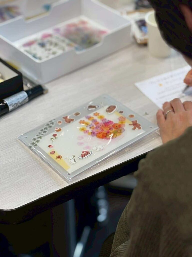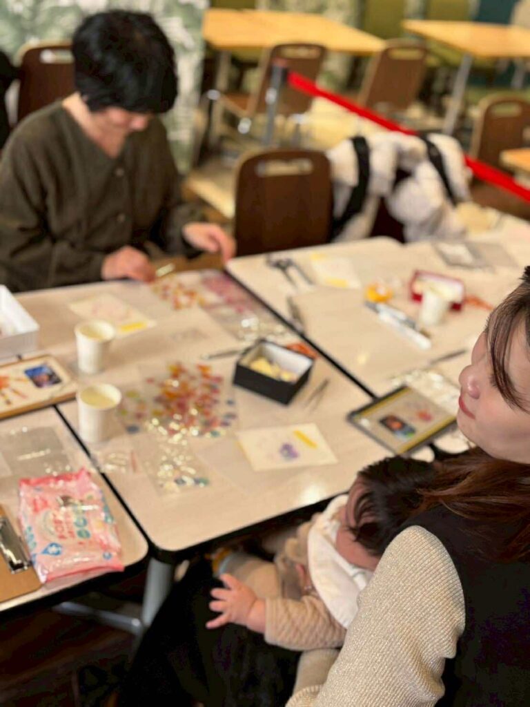 偶数月のワークショップはベビーちゃんの手形をお花のシールであしらうフォトフレーム作り